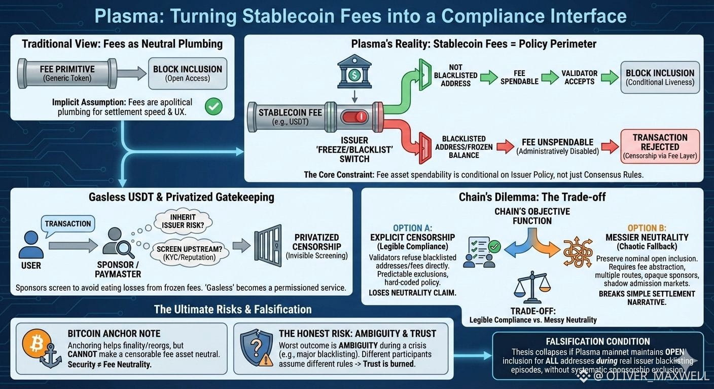 There’s a trade-off here that I don’t think Plasma can dodge forever: legible compliance versus messy neutrality. If Plasma embraces explicit policy-enforced censorship at the consensus edge, it may win institutional confidence while losing the ability to claim that base-layer inclusion is neutral. If Plasma tries to preserve permissionless inclusion, it probably has to tolerate chaotic fee fallback behavior: multiple fee routes, sponsors with opaque policies, and moments where some users are included only through privileged intermediaries. That breaks the clean settlement narrative because the “simple stablecoin settlement” system now contains a shadow admission market. Neither branch is “bad” by default, but pretending you can have stablecoin-as-gas and be untouched by issuer policy is naïve.