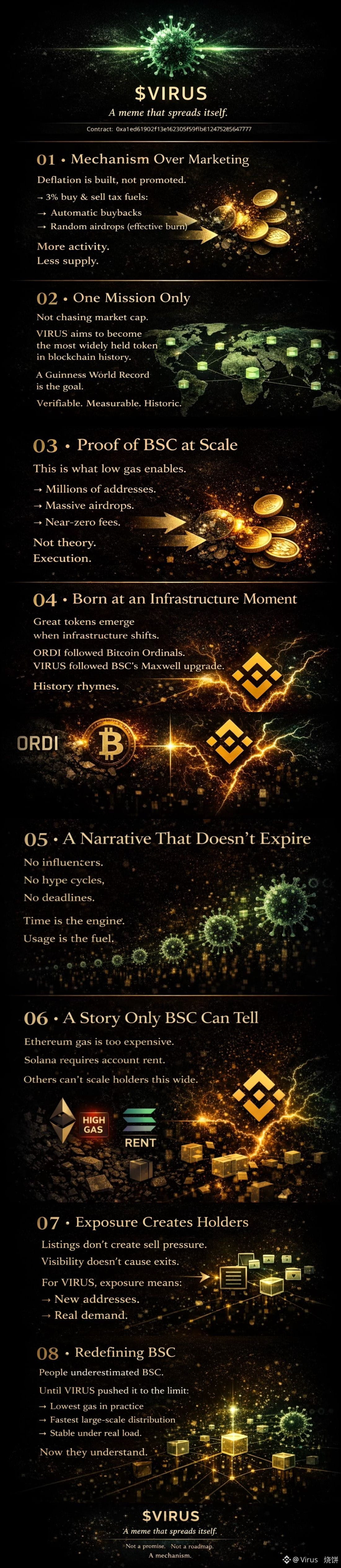 2025年夏天,BNB Chain(BSC)迎来了一次硬分叉升级——Maxwell。区块时间从3秒压缩到0.75秒,gas费用几乎归零。这不是小修小补,而是彻底解放了BSC的“大规模应用”潜力。就在这个窗口期,一个代币悄然诞生:$VIRUS(Virus)。它不是普通的meme币。它诞生于BSC的低gas时代,目标是成为区块链历史上持币人最多的代币,甚至冲刺百亿级别,超越TikTok、WeChat这些Web2顶流,让全世界第一次正眼看区块链。Virus的诞生:Ordinals如何启发它?还记得2023年的BTC Ordinals吗?区块突然能“铭刻”数据,催生了ORDI、BRC-20等铭文狂潮。同样,BSC的Maxwell升级让大批量、低成本的转账/空投成为可能。Virus团队抓住了这个机会:用极低的gas费用,实现海量空投。目前已空投数千万地址(社区数据显示超2300万+),直接“感染”了无数钱包。这不是作弊,而是对BSC性能的终极证明——千万笔交易几乎0费用,BSC真的能承载亿级用户。CZ(赵长鹏)过去多次在X上强调:BSC要优化gas、追求用户增长。Virus的玩法,简直是为他量身定制的“形象工程”。Virus的使命:感染所有人的钱包口号很直白——