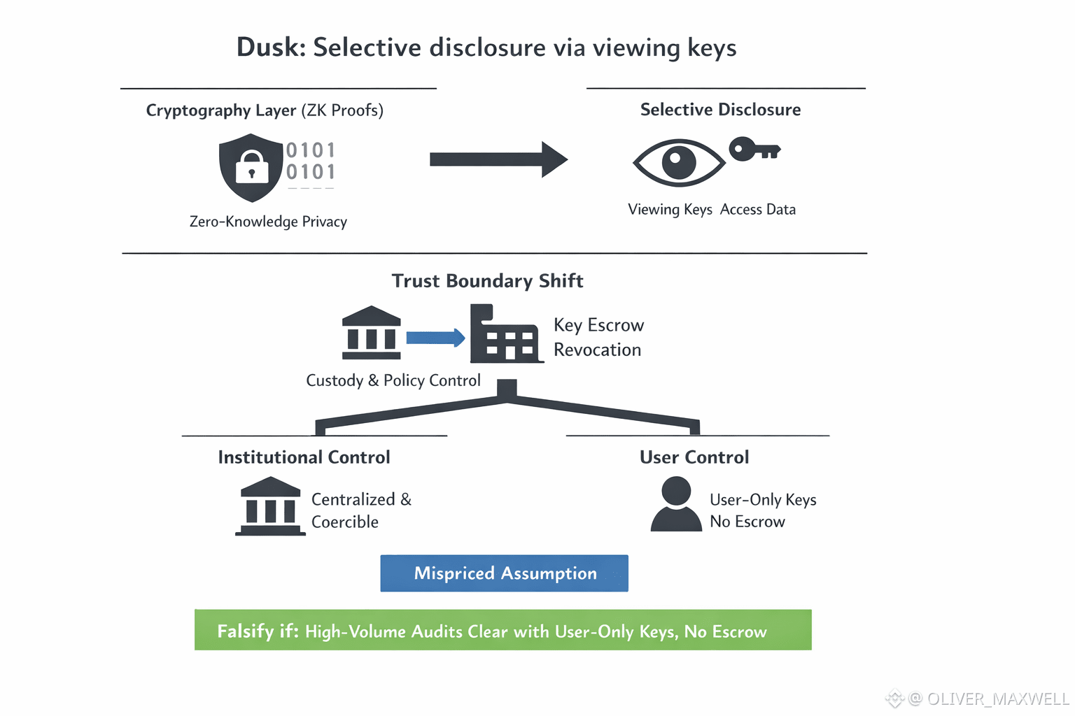 Until I see that outcome, I treat selective disclosure via viewing keys as the real battleground on Dusk. If you want to understand whether Dusk is genuinely mispriced, do not start by asking how strong the proofs are. Start by asking where the viewing keys live, who can compel their use, how policy is enforced, and whether the system is converging toward a small governed surface that can see everything when pressured. That is where privacy either holds, or quietly collapses.