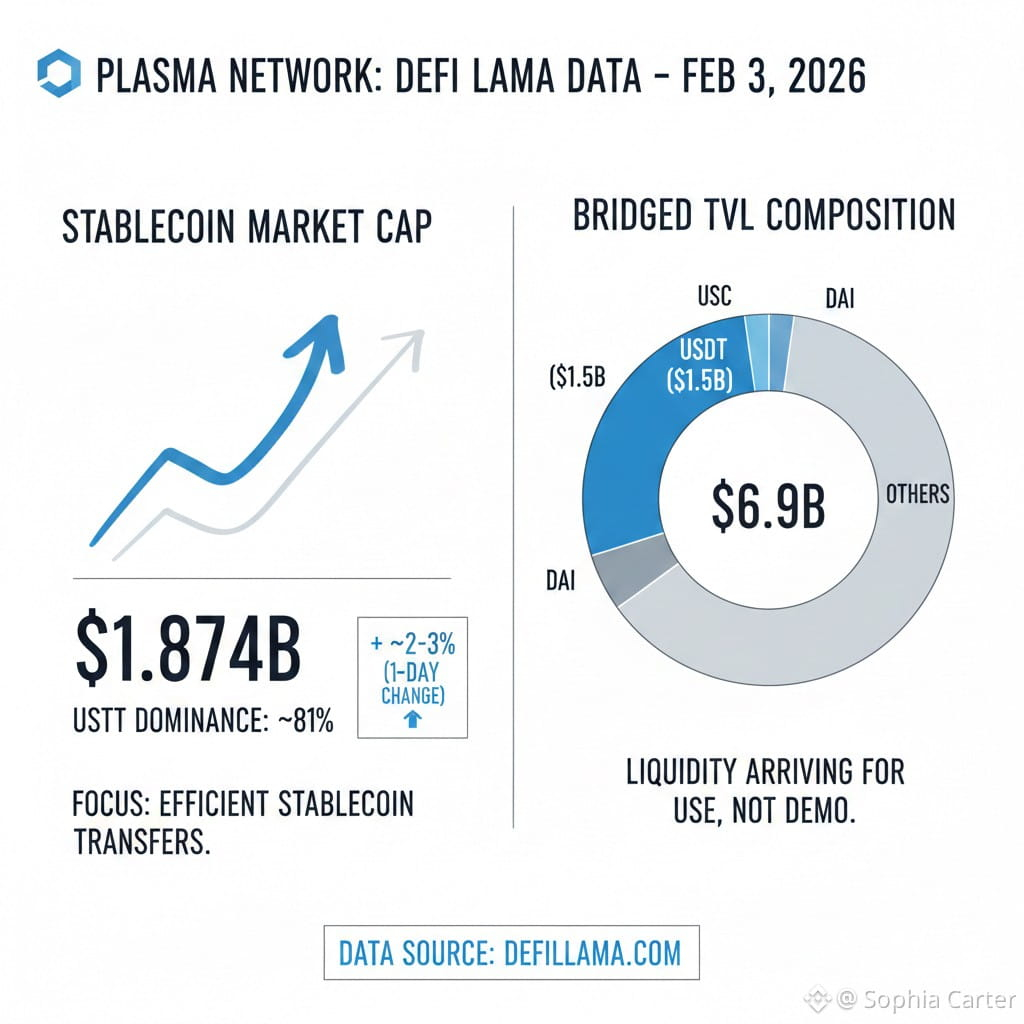 The chain-level data supports that “this is about dollars” vibe. On DefiLlama, Plasma’s stablecoin market cap is shown around $1.874B with USDT dominance ~81%, and the 1-day change is positive (a few percent up, depending on the moment you check). That’s not a vanity metric; it’s the kind of concentration you’d expect if the network’s job is basically “move stablecoins efficiently,” not “host every experimental asset under the sun.”