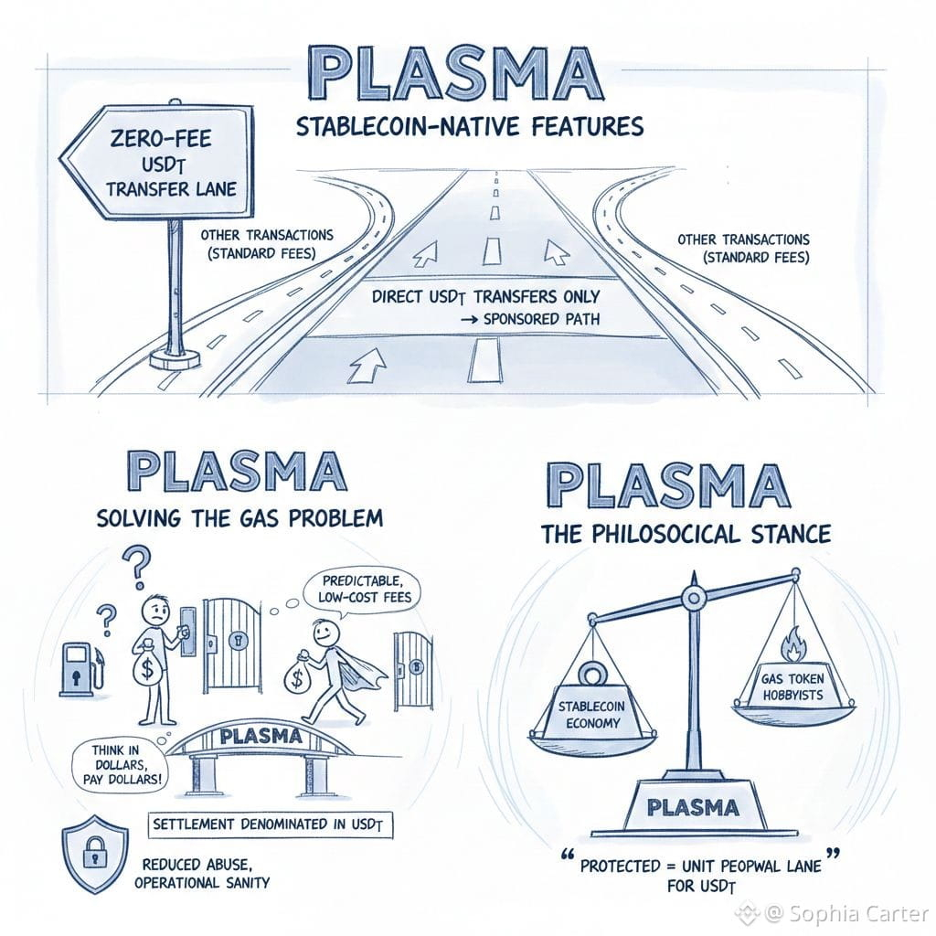 That’s why the “stablecoin-native” features matter more than the buzzwords. Plasma’s zero-fee USD₮ transfer lane isn’t pitched as a magical “free gas forever” promise; it’s engineered as a narrowly-scoped sponsored path (direct USD₮ transfers only), with controls meant to reduce abuse and keep the system operationally sane for real integrators. The framing here is different from typical crypto UX patches: Plasma is treating stablecoin transfer like a protected highway lane that exists because the economy needs it, not because a wallet team added a clever trick.