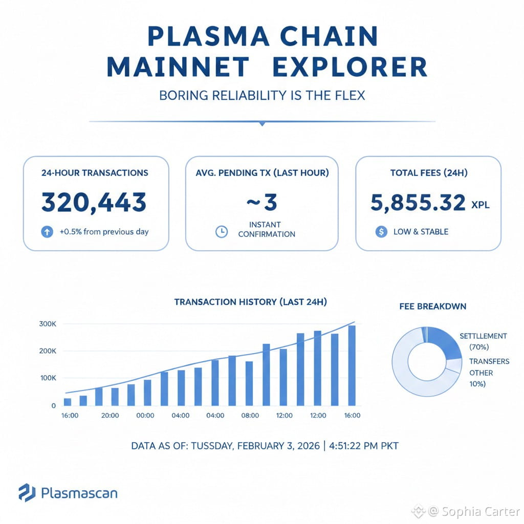 In the last 24 hours, Plasma has looked less like a “crypto project” and more like a piece of quiet plumbing that’s doing its job. Plasmascan shows 320,443 transactions in 24h, ~3 pending transactions on average in the last hour, and 5,855.32 XPL in total transaction fees (24h).