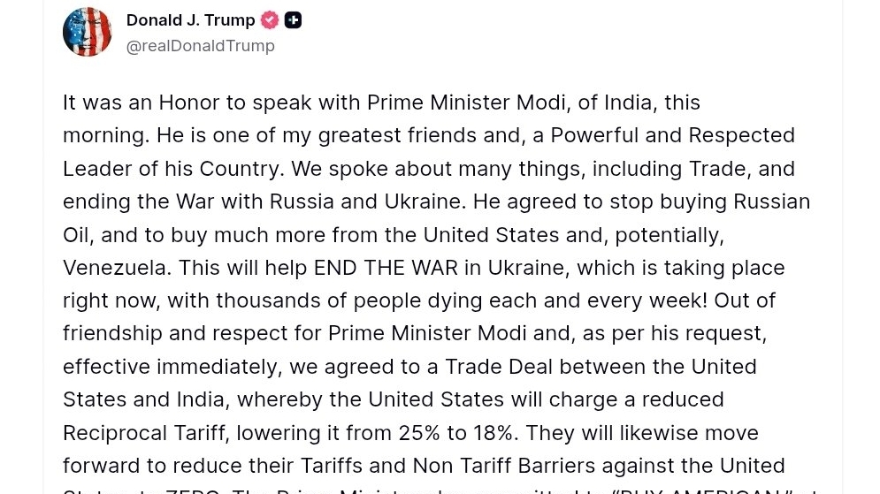 - Il PM Modi ha confermato che l'India rimuoverà tutte le tariffe per gli Stati Uniti e Trump ha confermato che gli Stati Uniti ridurranno le loro tariffe dal 25% al 18% per l'India.