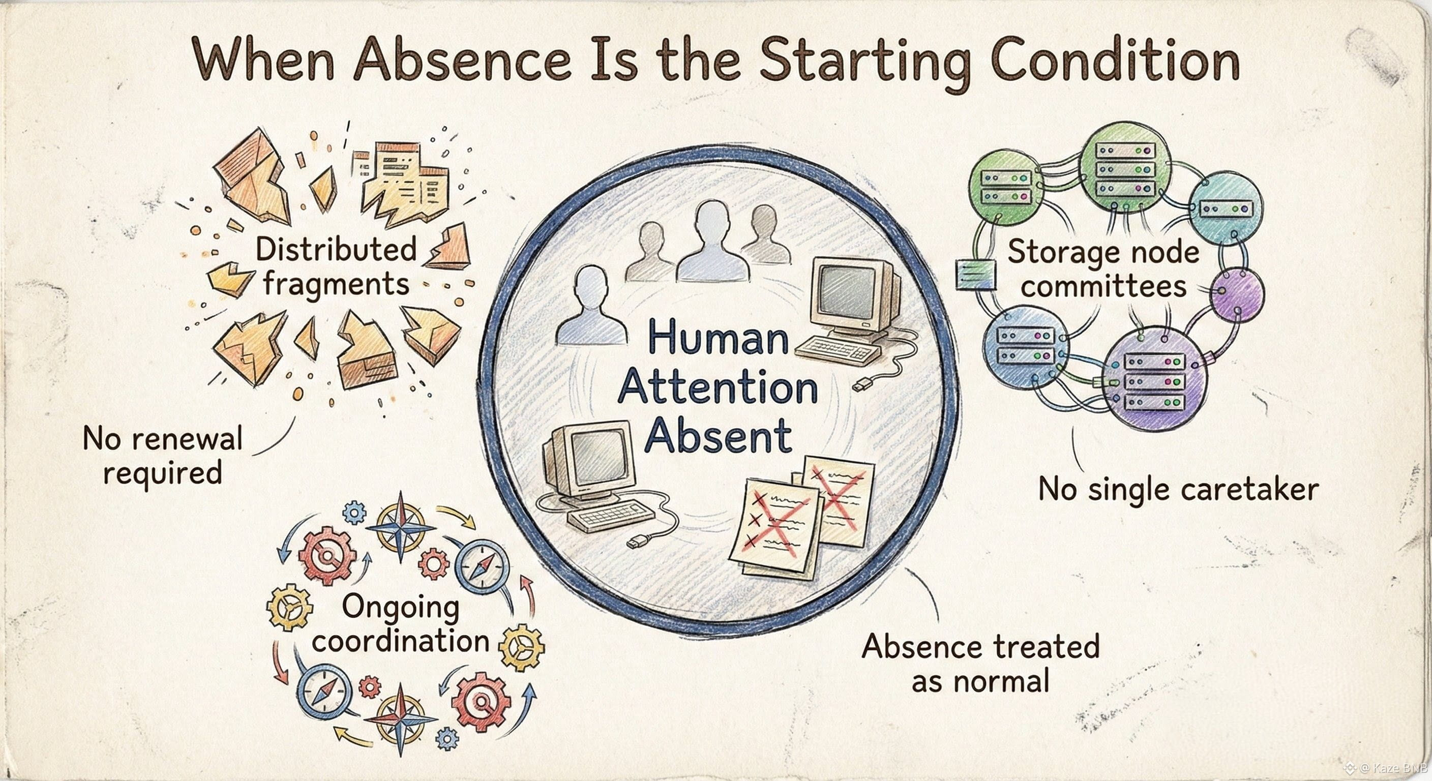 Not as an error, not as a warning, but as a realization that something everyone assumed would still be there quietly isn’t. Most storage systems are built to postpone that moment. They depend on someone staying present, renewing, pinning, checking, remembering. As long as attention holds, persistence feels real.