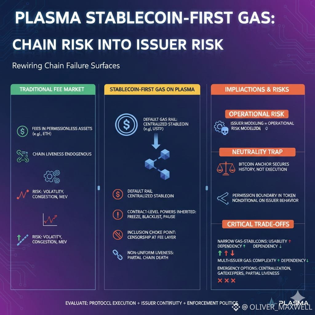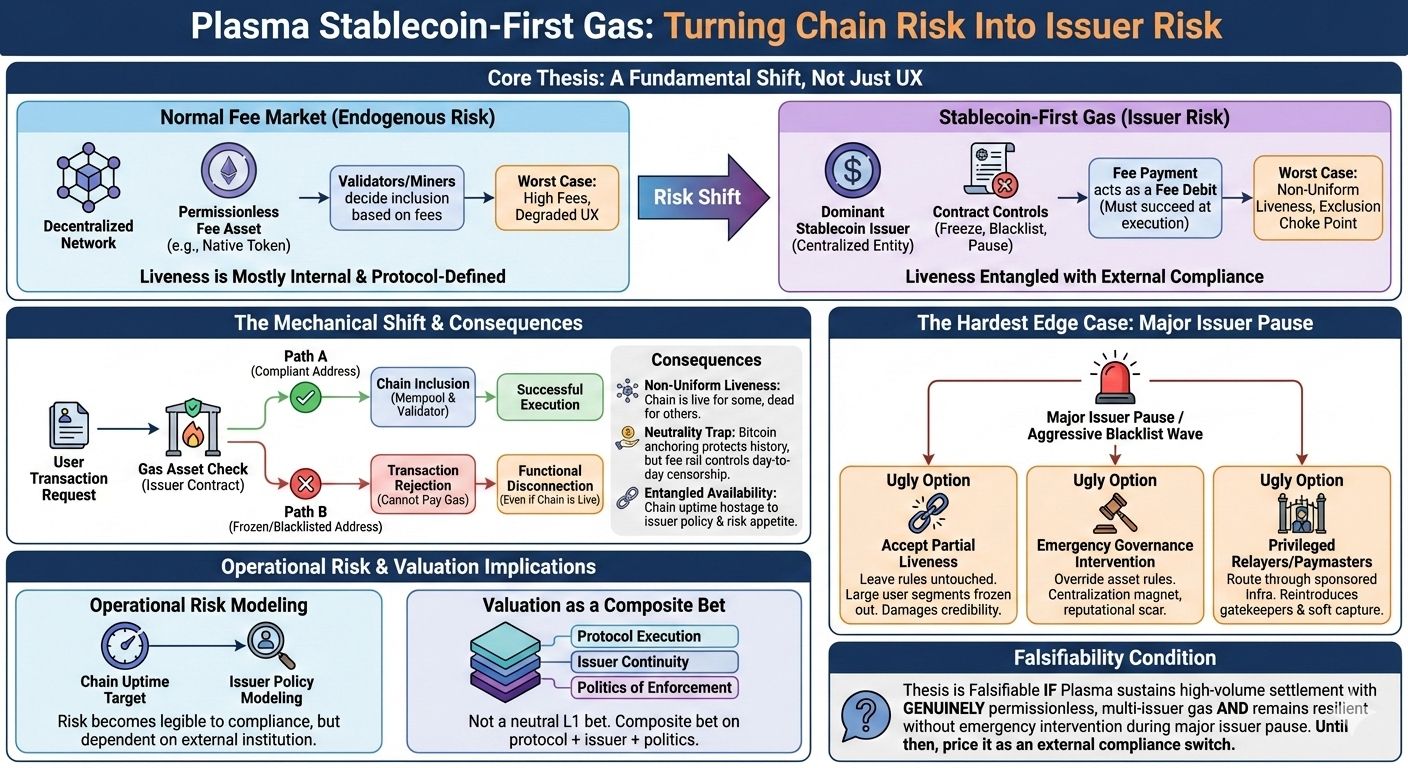 On Plasma, I keep seeing stablecoin-first gas framed like a user-experience upgrade, as if paying fees in the stablecoin you already hold is just a nicer checkout flow. The mispricing is that this design choice is not cosmetic. It rewires the chain’s failure surface. The moment a specific stablecoin like USDT becomes the dominant or default gas rail, the stablecoin issuer’s compliance controls stop being an application-layer concern and start behaving like a consensus-adjacent dependency. That’s a different category of risk than fees are volatile or MEV is annoying. It’s the difference between internal protocol parameters and an external switch that can change who can transact, when, and at what operational cost.