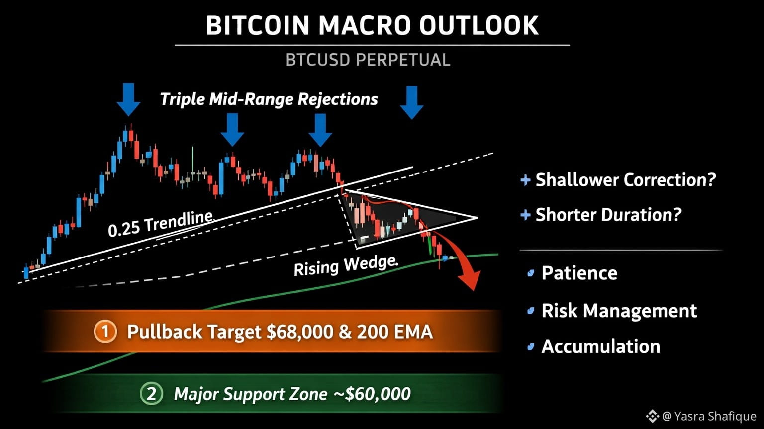 Il supporto macro chiave rimane vicino a **$60k**, mentre un ideale reset tecnico sarebbe intorno a **$68k**, allineandosi con la EMA settimanale a 200. È importante notare che il tempo è ancora dalla parte di Bitcoin: una consolidazione prolungata spesso alza sia il fondo eventuale che il livello di breakout.