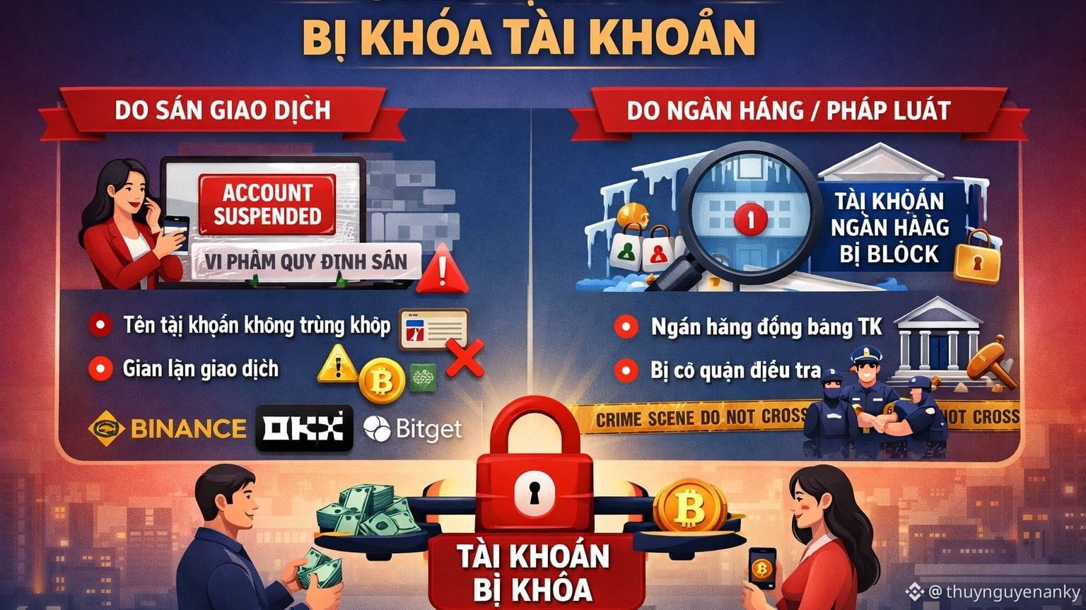 Non è la piattaforma a bloccare direttamente perché stai scambiando P2P, ma da parte di terzi (come banche, autorità investigative) che bloccano temporaneamente il tuo conto bancario o il tuo wallet per sospetti legati a attività illegali: