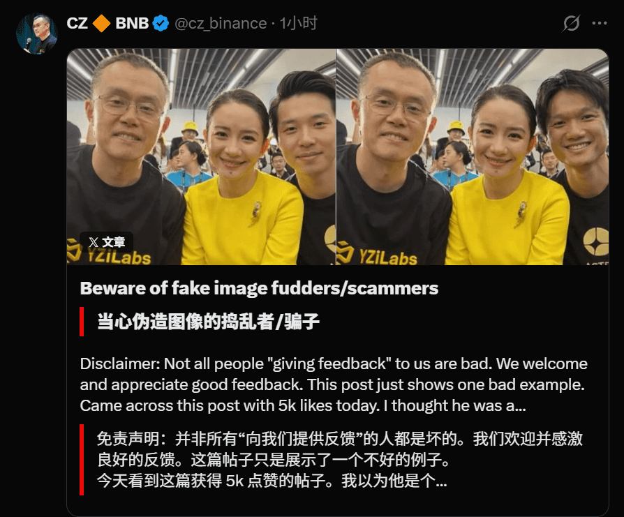 Zhao Changpeng (CZ), fondatore di Binance, ha fatto una denuncia pubblica sui social media, aprendo una breccia nel caos informativo di Web3. Quando la falsificazione di credenziali autorevoli diventa un codice del flusso, la pietra angolare della fiducia nella comunità crittografica viene erosa silenziosamente. Un account con 860000 fan ha cercato di presentarsi come “partner intimo” di CZ all'evento BNB Chain utilizzando una foto PS grezza, ma è stato smascherato sul posto.