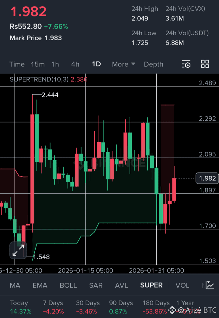 On the 1D timeframe, we can see price reclaiming key levels and attempting to flip previous resistance into support. The recent bounce is backed by healthy volume, signaling that buyers are stepping in with confidence. The Supertrend indicator is still above price, but momentum is shifting fast — a daily close above 2.05–2.10 could trigger a full trend reversal.