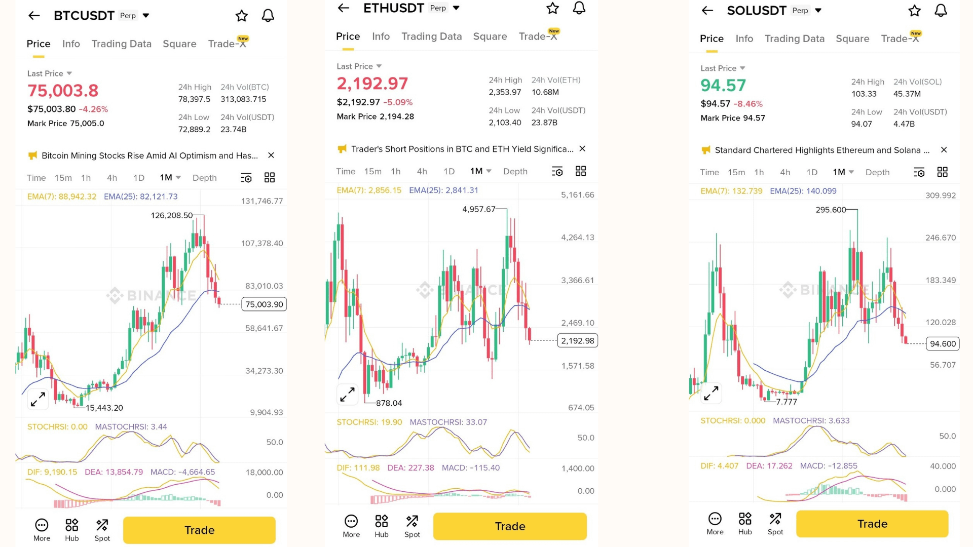 #Bitcoin (BTC), #Ethereum (ETH) e #Solana (SOL) rivelano un ritracciamento sincronizzato, con le candele che mostrano massimi più bassi e chiusure in mezzo a un'alta volatilità. Ciò segnala una debolezza a breve termine in un più ampio raffreddamento post-rally.