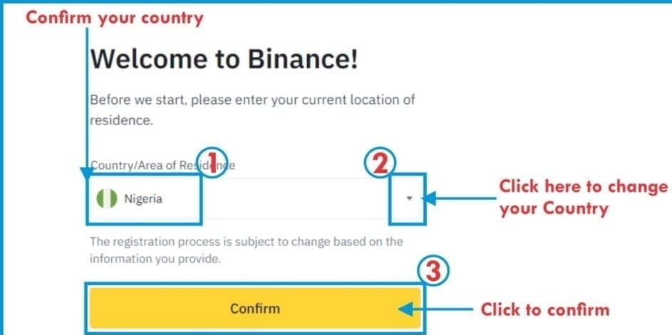 Seleziona il tuo paese. Binance di solito rileva automaticamente il tuo paese in base al tuo IP. Confermalo o seleziona quello corretto dal menu a discesa.