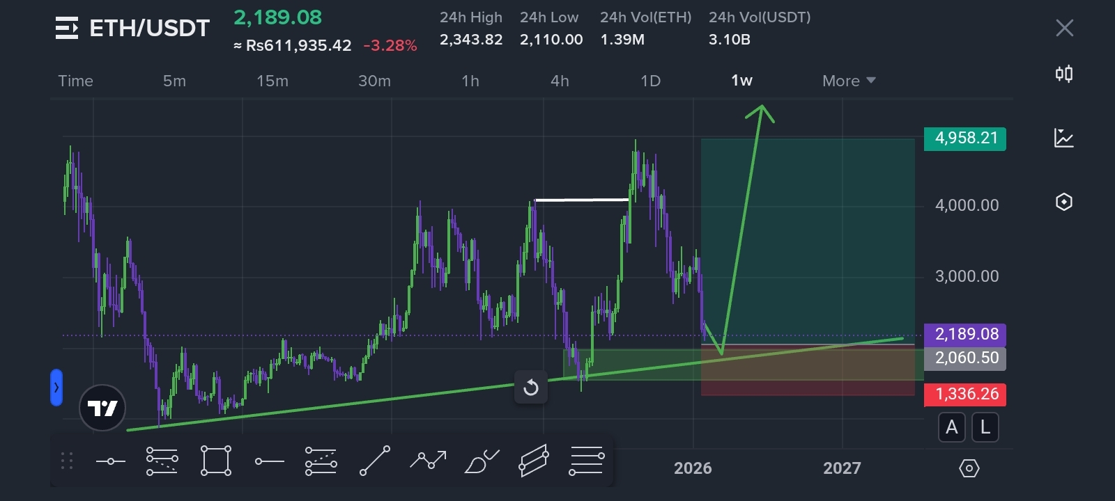 $ETH si sta avvicinando a una forte zona di supporto a lungo termine dopo la recente correzione, mantenendo una struttura di mercato rialzista sia nei grafici giornalieri che settimanali.