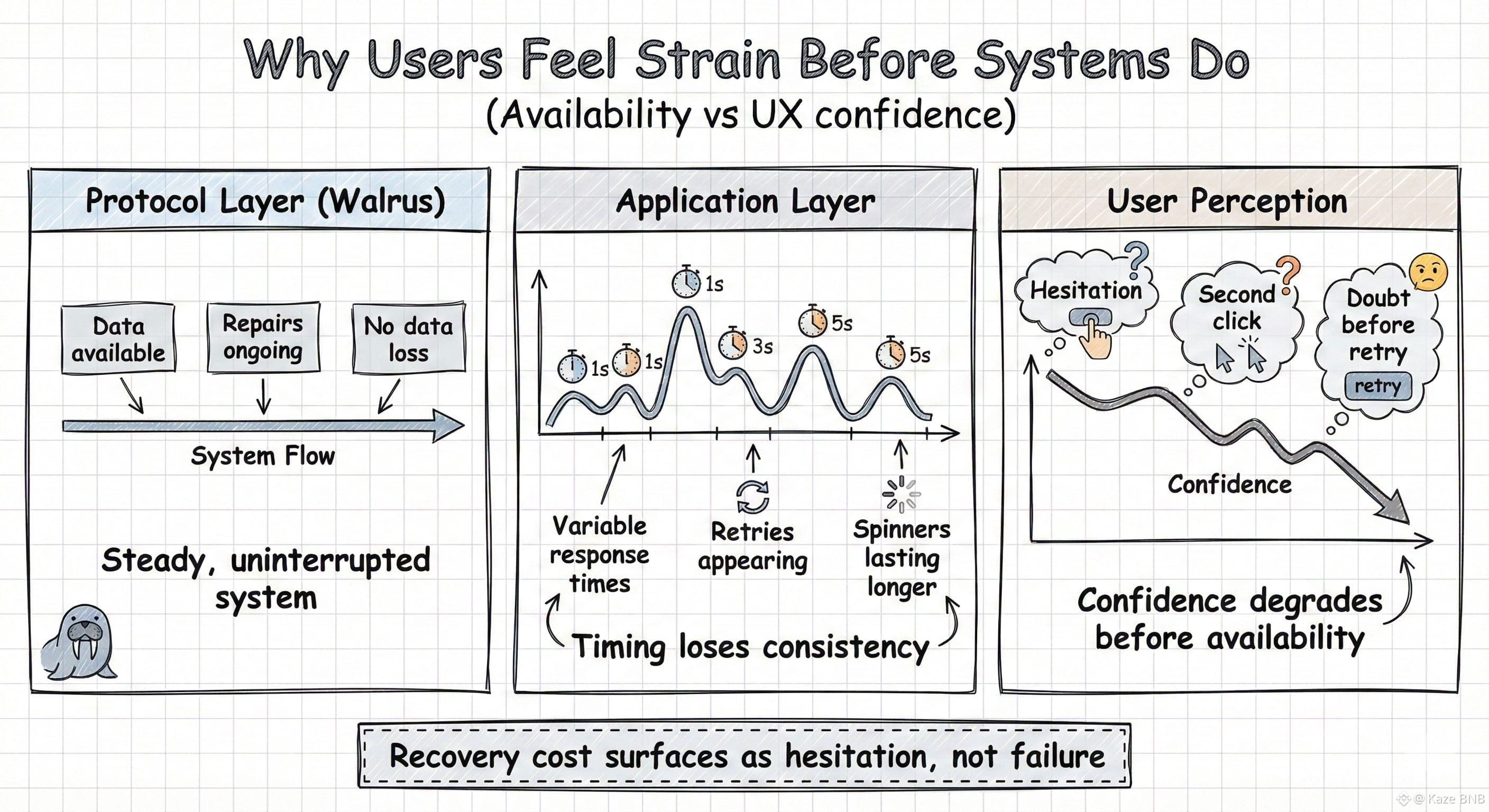 Teams start noticing it in the margins. Build pipelines add quiet buffers. Application logic gains small checks that weren’t part of the original design. Not because Walrus is unreliable, but because it refuses to pretend that storage is ever truly passive.