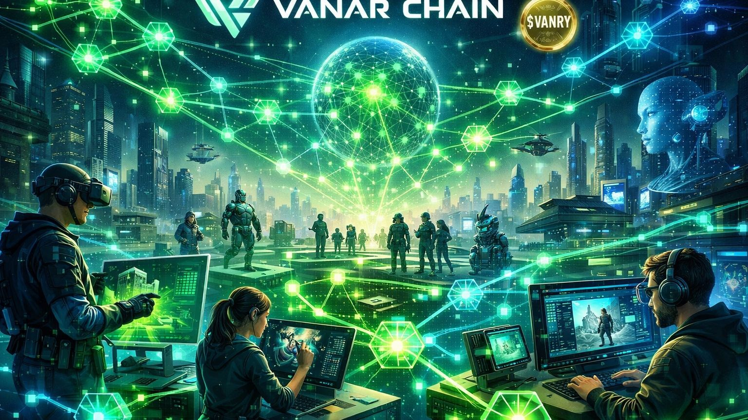 Immagine di un paesaggio digitale cinematografico che mostra nodi interconnessi che brillano di luce verde, simboleggiando scalabilità, creatività e fiducia attraverso l'ecosistema Vanar Chain con costruttori, creatori e giocatori che collaborano in un ambiente metaverso unificato.