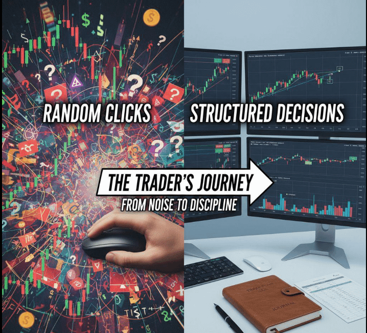 Quasi ogni trader inizia allo stesso modo: cliccas random, ingressi emotivi, rincorrere candele verdi e chiudere operazioni basate sulla paura piuttosto che sulla logica. In questa fase, il trading sembra entusiasmante, veloce e imprevedibile. Le vittorie sembrano abilità. Le perdite sembrano sfortuna.