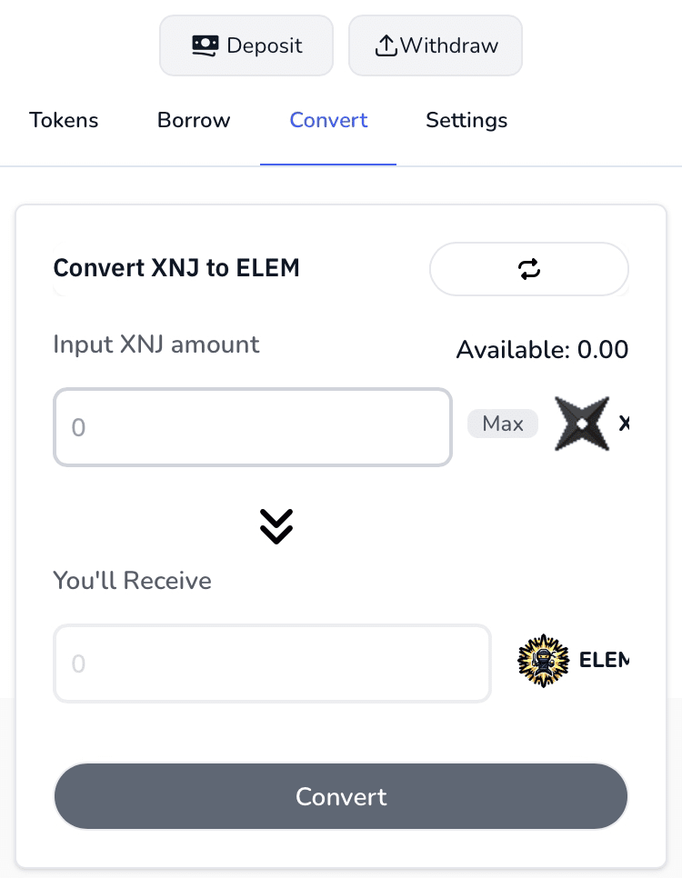 Successivamente potrai convertire i tuoi $XNJ in $ELEM, che potranno essere utilizzati per far salire di livello i tuoi ninja e acquistare prodotti alimentari dal mercato!