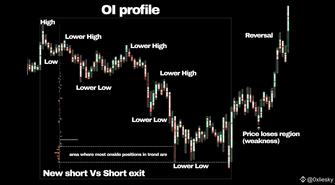 Nell'immagine qui, puoi vedere un esempio di debolezza di downtrend. Lo strumento utilizzato è un profilo Open Interest.
