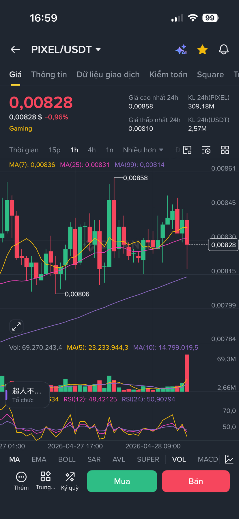 PIXEL hiện giao dịch tại 0,00828 USDT, giảm nhẹ 0,96% trong 24h. Sau nhịp tăng mạnh trước đó, token đang bước vào giai đoạn sideway – tích lũy với biên độ hẹp và lực mua – bán khá cân bằng.