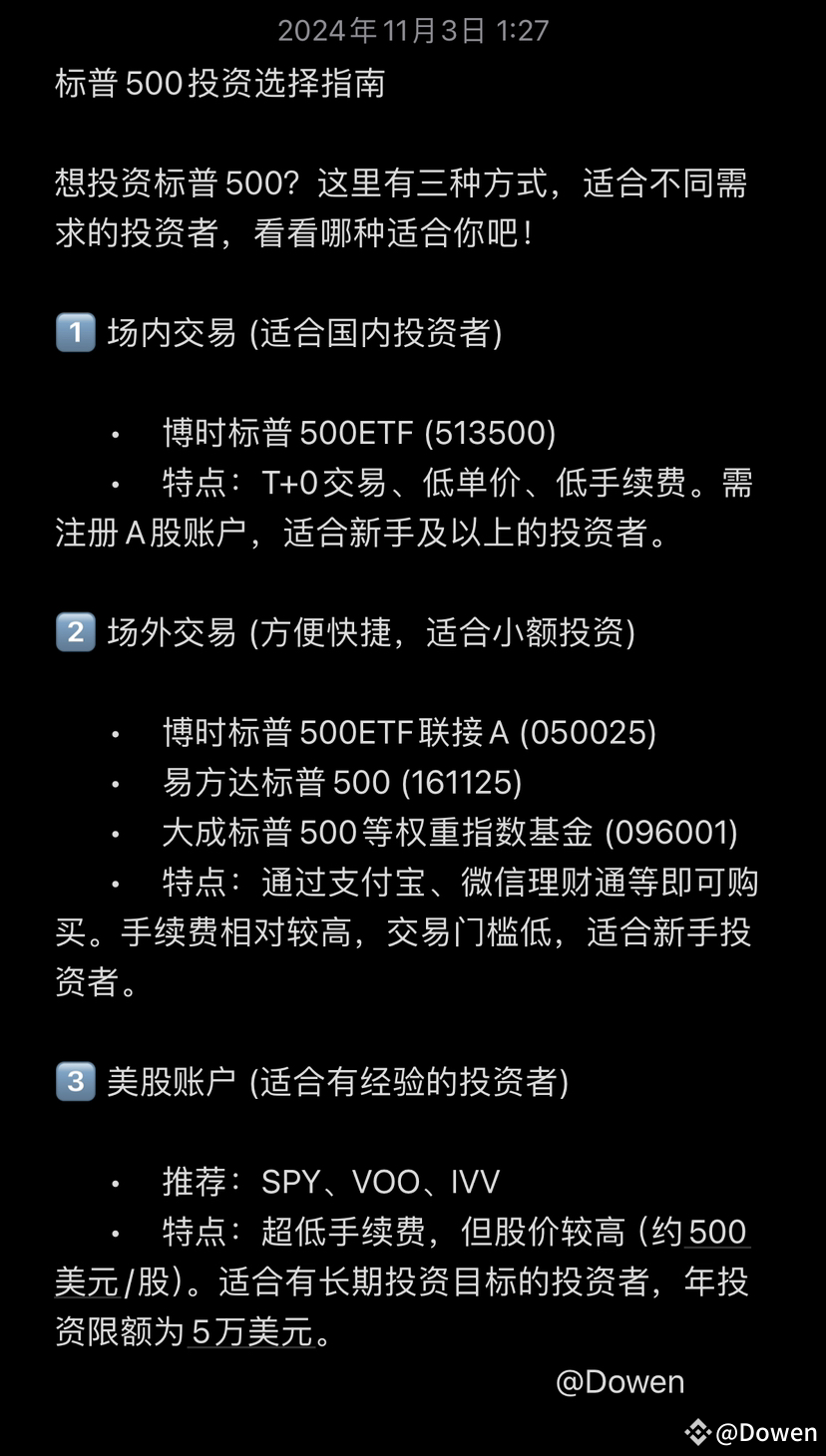 无论选择哪种方式,标普500作为一个长期投资的经典标的,其稳定性和成长性都可以为投资者带来潜在的回报。希望以上信息对你的投资决策有所帮助!