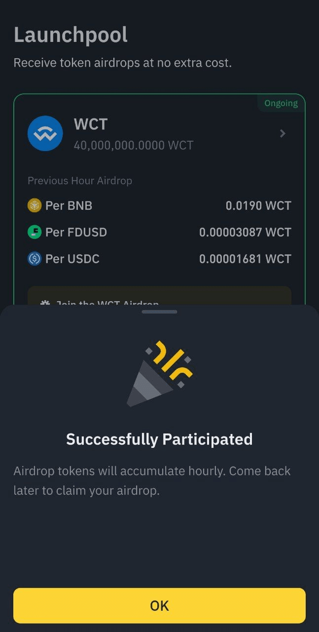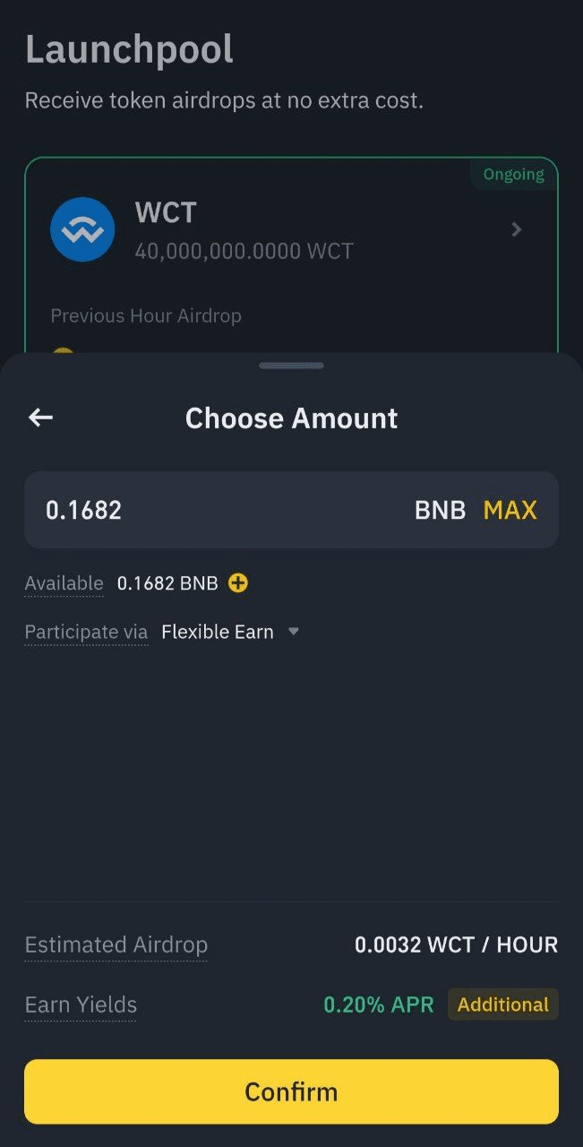 Now hit confirm button and you have successfully participated in the $WCT launchpool.