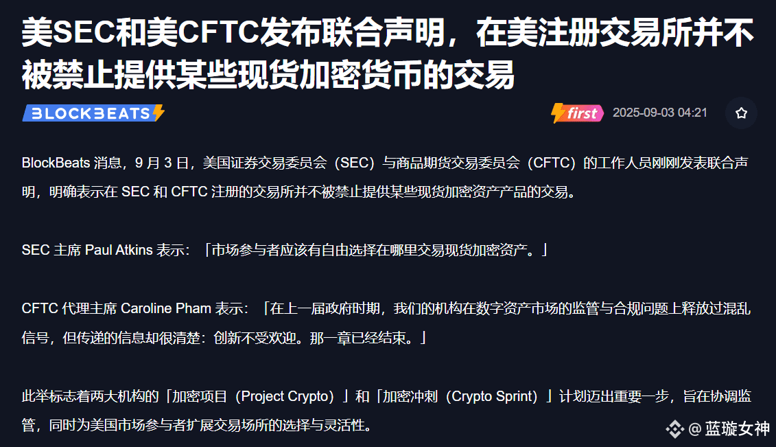重大突发!美国两大金融巨头——SEC(证监会)和CFTC(商品期货委员会)正式联手,为注册公司的现货加密货币交易扫清障碍!
