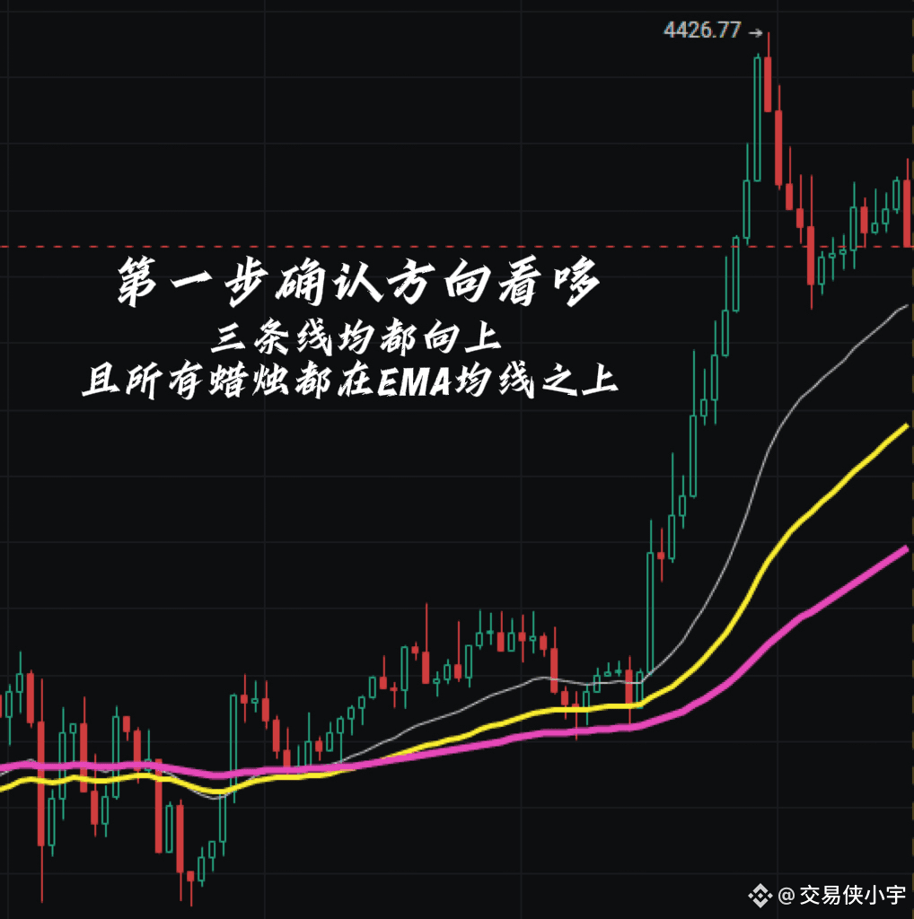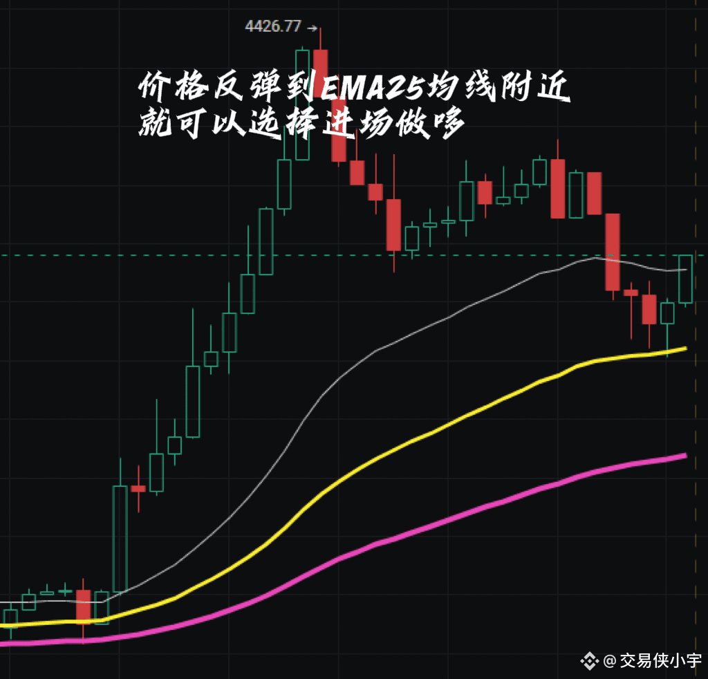 在9.5日17:30分时我们可以看到走势为典型的三均线看哆趋势,这个时候我们只需要等待价格回调到25日均线和50均线附近,就可以进哆单了。