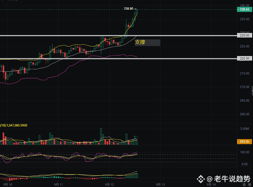 兄弟们,我是老牛。盘面显示,SOL这波从215附近发起的攻势,最高精准插针到了238.65,而不是之前说的238.8,目前价格在这个高点附近强势整理。核心的“多空分水岭”支撑就是我图上画的那条线——229,这个位置守不住,短期势头就可能转弱,往下看225甚至220.5。成交量(VOL)显示最近一小时放了点量,但整体是缩量调整,属于健康走势,均线多头排列也没变。