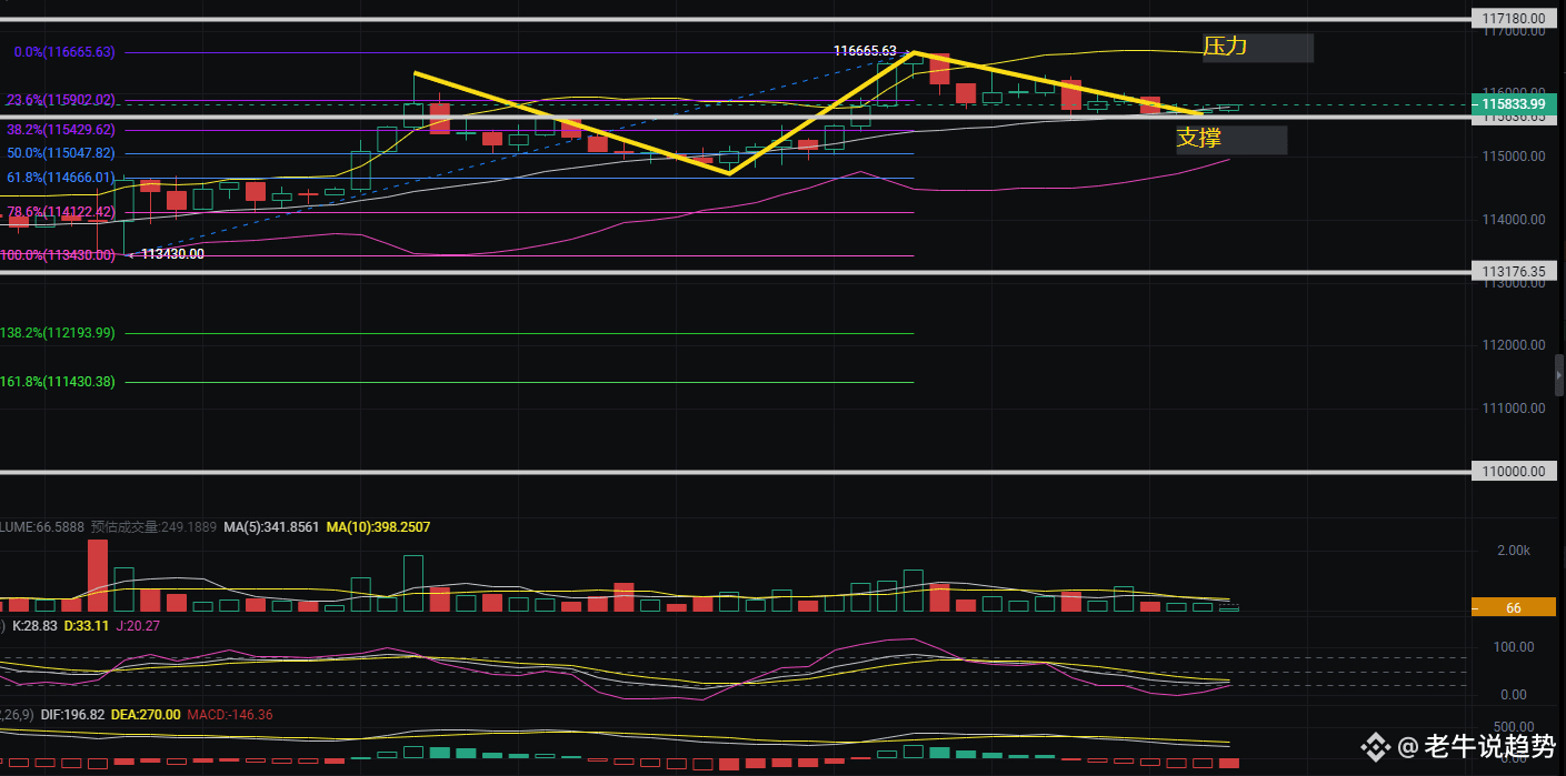 我个人认为,当前量能持续萎缩,MACD在零轴附近粘合,KDJ在中轨徘徊,这些都表明市场处于蓄势阶段。这种整理格局不会持续太久,很快就会选择方向。建议重点关注115000支撑位的有效性,这个位置一旦跌破,可能会引发短线回调至114666-114122区间;若能守住,则仍有上攻116665压力位的动能。