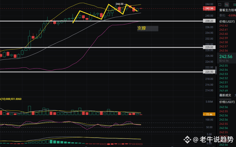 从实时盘面来看,SOL目前报价242.56 ,正被244.00这个关键压力位死死压制。这个位置已经形成三重顶压制,每次触及244附近就像碰到高压线般回落。下方的防御阵地设在238.20附近,这个支撑位已经过多次回踩确认。当前价位恰好处在黄金分割线的0.618关键位,这种位置往往意味着变盘在即。
