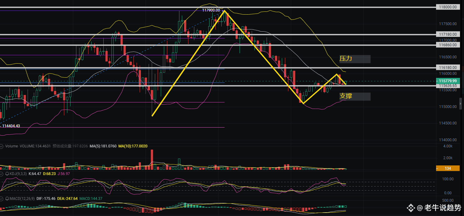 老铁们,我是老牛。当前BTC一小时K线进入关键三角收敛形态,上方117900压力线如锅盖压顶,下方115636支撑形成多头防线,价格在116000附近反复试探。成交量持续萎缩(Volume仅197.82),市场陷入焦灼状态。