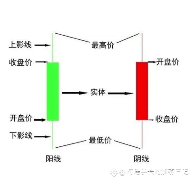 我们学习K线,是因为我们面对的最多的就是K线。K线图主要的组成部分就是两个:阳线、阴线.币圈绝大部分的交易所和分析软件都是绿色代表阳线、红色代表阴线(与股市相反)。简单来说,阴阳代表趋势方向,阳线表示将继续上涨,阴线表示将继续下跌。实体大小代表内在动力,实体越大,上涨或下跌的趋势越是明显,反之趋势则不明显。影线代表转折信号,向一个方向的影线越长,越不利于币价向这个方向变动,即上影线越长,越不利于币价上涨,下影线越长,越不利于币价下跌。