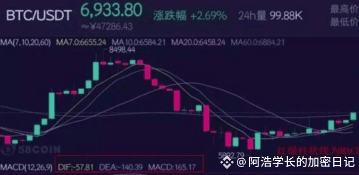 MACD称为指数平滑移动平均线,是从双指数移动平均线发展而来的,由快的指数移动平均线(EMA)减去慢的指数移动平均线。MACD是一个整体,除了MACD柱状反转外,更需搭配起来注意的是DIF、DEA线。