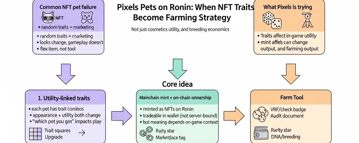 but Pixels pets are minted as NFTs on the Ronin network, and the part that caught my eye is traits aren’t only cosmetic. each pet has a combo of traits that changes both appearance and in-game utility. that matters because it means the mint result can actually affect your farming operation, not just your profile pic. that’s a design choice with real economic consequences, because now “which pet you got” can impact your output, not only resale price.