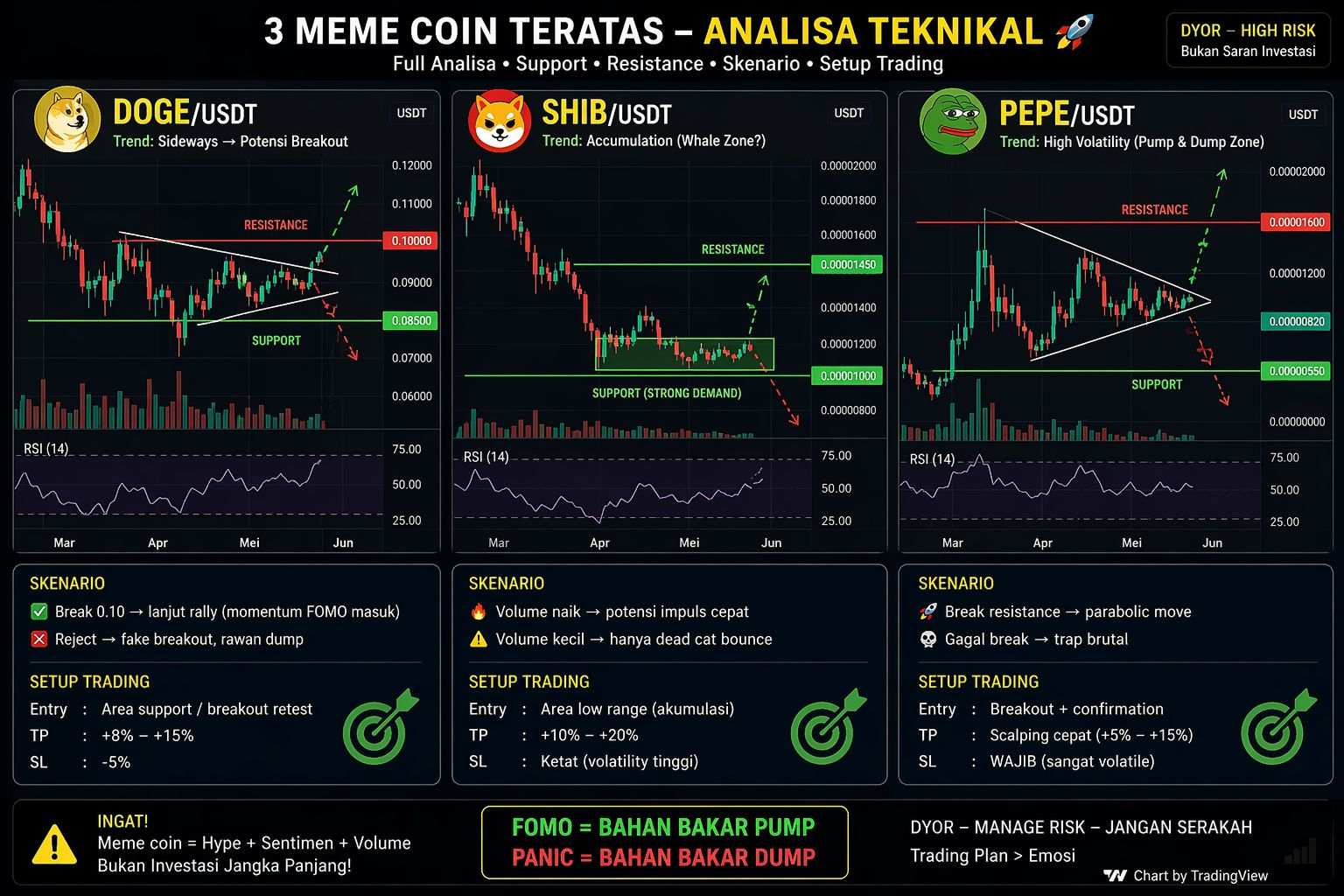 Banyak yang masuk telat, beli di puncak… lalu hancur dalam hitungan jam. Hari ini gue breakdown 3 meme coin paling panas sekarang. Bukan buat hype semata — tapi biar kamu gak jadi exit liquidity.
