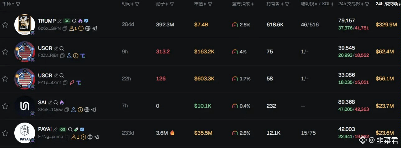 过去 24h Solana 热门代币前五依次为:TRUMP、USCR、USCR、SAI、PAYAI