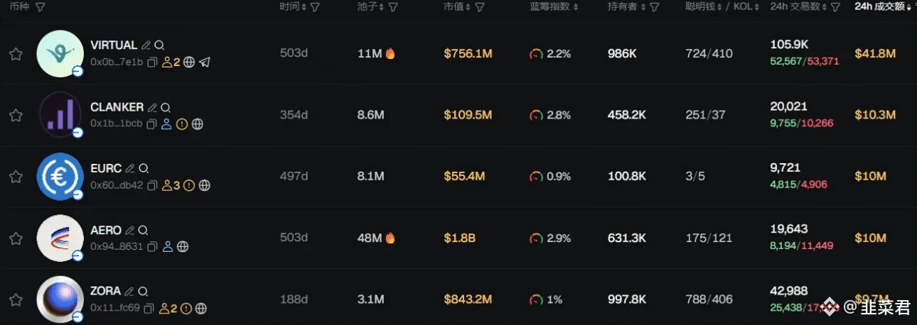 过去 24h Base 热门代币前五依次为:VIRTUAL、CLANKER、EURC、AORA、ZORA