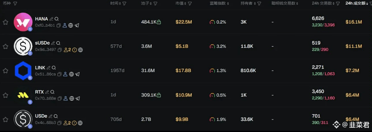 过去 24h ETH 热门代币前五依次为:HANA、sUSDe、LINK、RTX、USDe