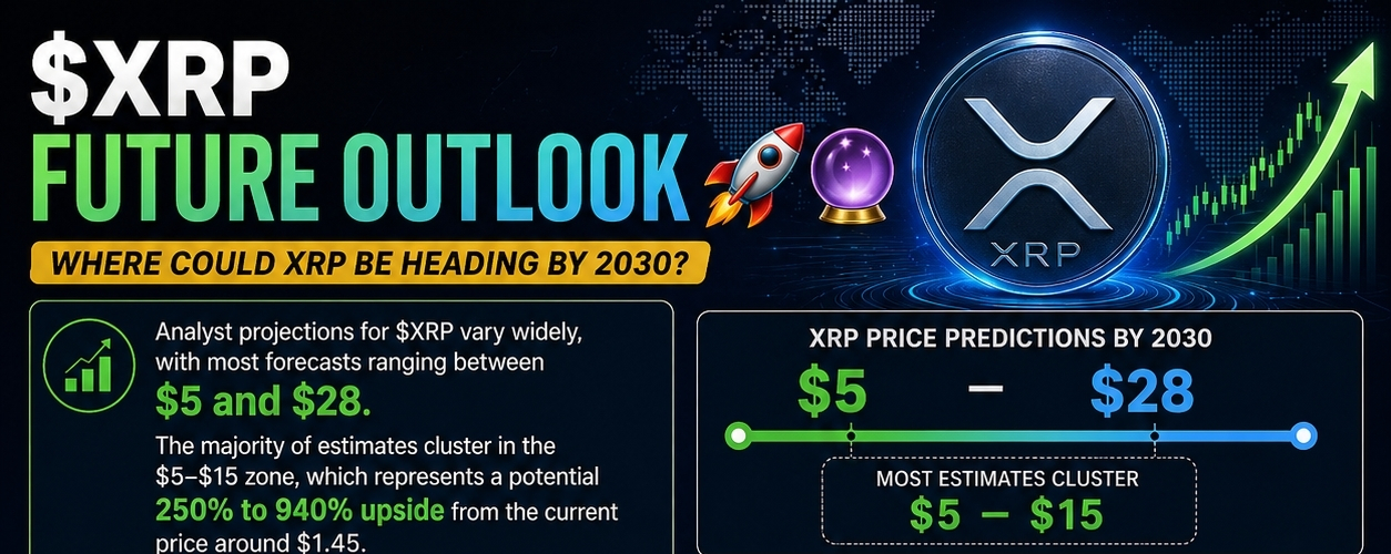 Analyst projections for $XRP vary widely, with most forecasts ranging between $5 and $28. The majority of estimates cluster in the $5–$15 zone, which represents a potential 250% to 940% upside from the current price around $1.45.
