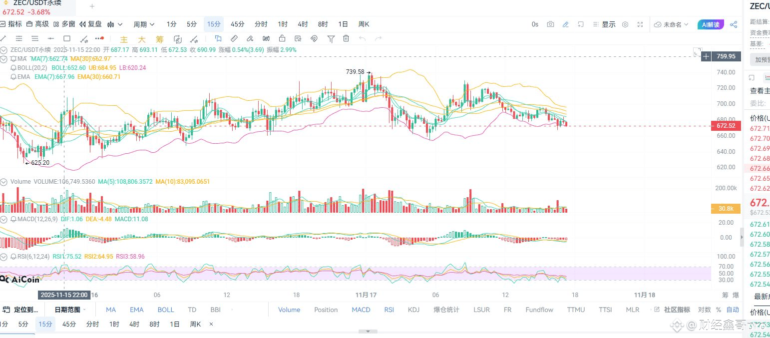 短线突击(15分钟周期):现价672.52可以轻仓试空,止损就放在685,也就是EMA7上方,守住成本线最关键。第一目标看650的筹码密集区,第二目标直接看到625,盯着布林下轨延伸位走。