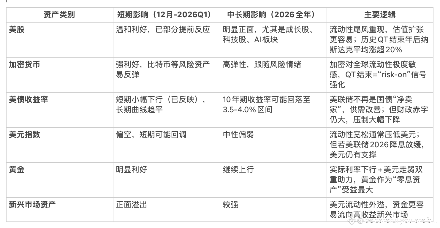 总结:12月停止QT是2025年底-2026年最重要的流动性正面事件之一,相当于把过去3年的“隐形刹车”彻底松开。对风险资产(股票、加密、黄金)整体是中长期利好,尤其利好高估值成长股和比特币等高贝塔资产。短期市场可能震荡消化,但趋势上已从“紧缩尾声”进入“宽松前夜”,建议关注12月FOMC会议后风险资产的加速表现。