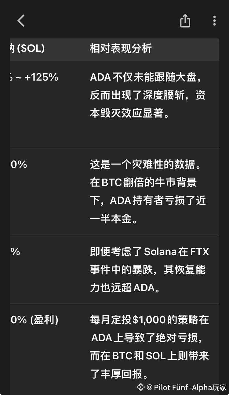 3.1投资回报率(ROI)的横向基准测试,在过去的一年中,持有ADA不仅没有产生超额收益(Alpha),甚至连基本的市场平均收益(Beta)都未能捕获。 对于DCA投资者而言,最痛苦的不是资产价格的波动,而是“机会成本”的永久性丧失。当你将资金投入ADA时,你实际上是在做空比特币和索拉纳。在过去的一年里,这种“做空”行为导致了相对于比特币约130%的相对亏损。
