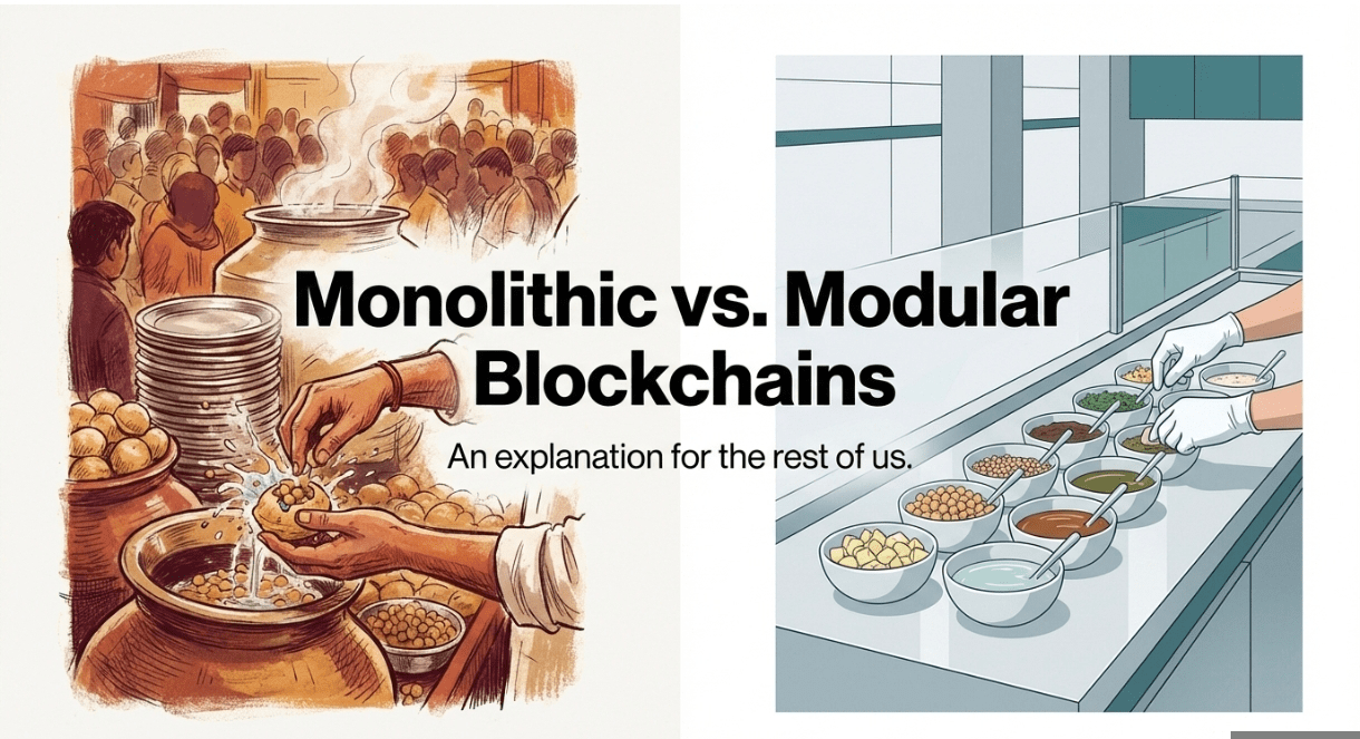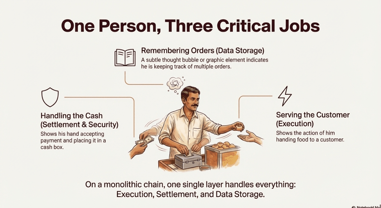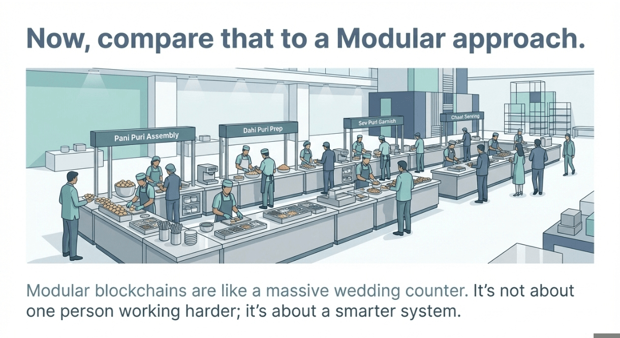 Now, compare that to a massive Wedding Chaat Counter. You don't see one guy struggling there. You see an assembly line: one guy punches the puri, another stuffs the masala, a third dips the pani and serves, and a totally separate guy handles the coupons and cash. That is a Modular Blockchain.