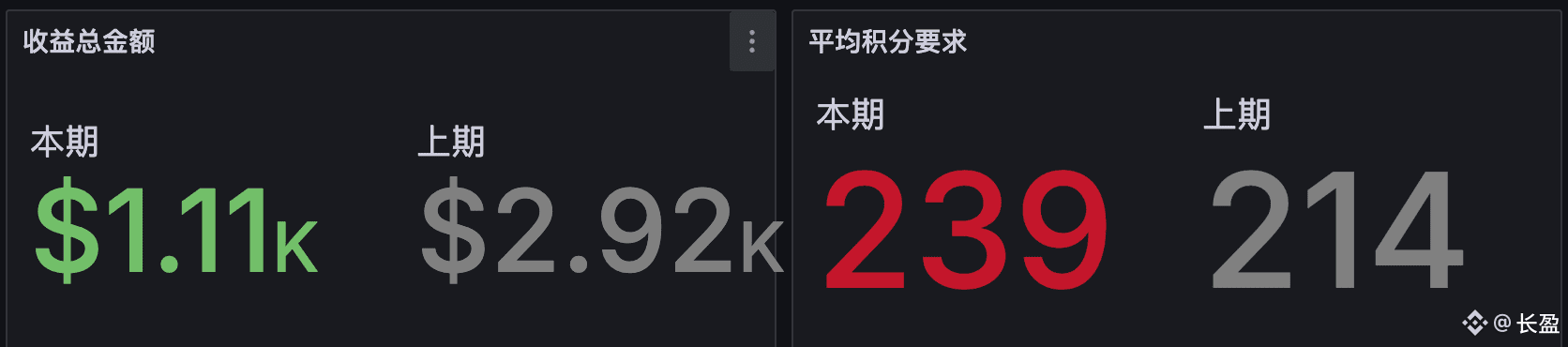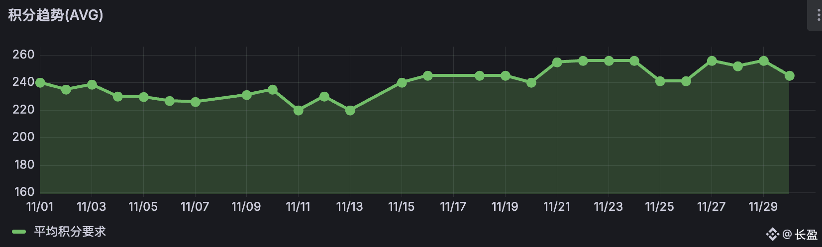 整个11月全部空投收益才1100u左右,平均积分门槛来到了239分,平均收益34U,也就是平均每个账号能领4次,也就是单账号102U,此处泪流满面😭