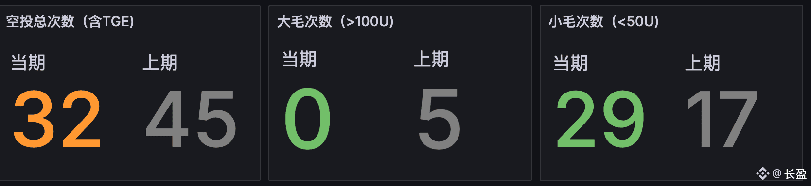 空投次数32次,较10月还少13次。大毛0个,小于50U的占比 90%