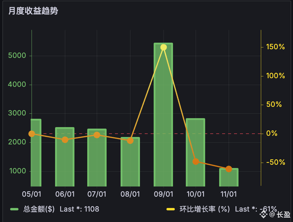 再月度收益曲线,相比惨兮兮的10月,11月收益再次负增长 61%,可怜兮兮~