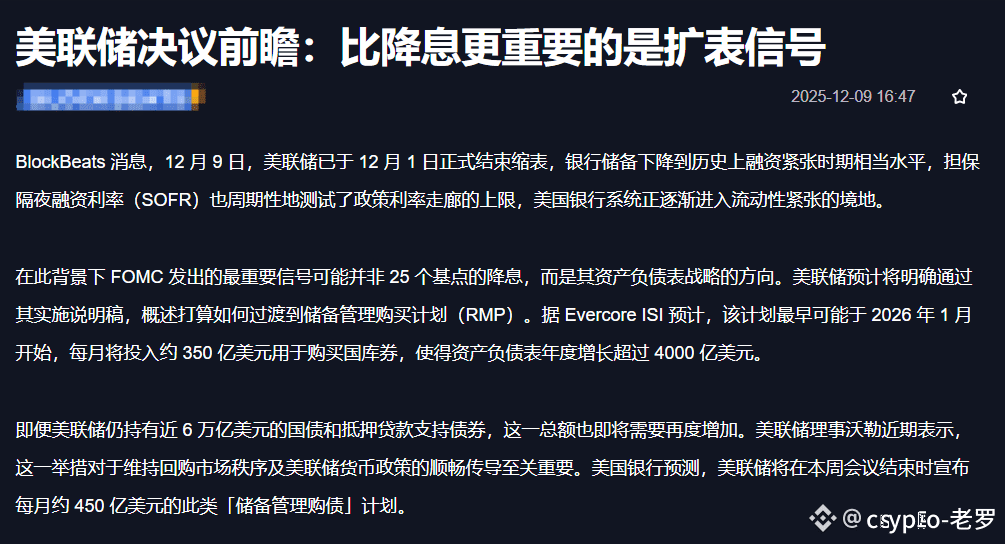比降息更重要的是扩表信号!——让我们把这句话刻在今天的交易屏幕上。北京时间今夜,美联储将公布利率决议。但真正的风暴眼,早已不是那场被所有人盯着的降息大戏,而是流动性干涸的河床,是否等来了第一缕开闸的信号。