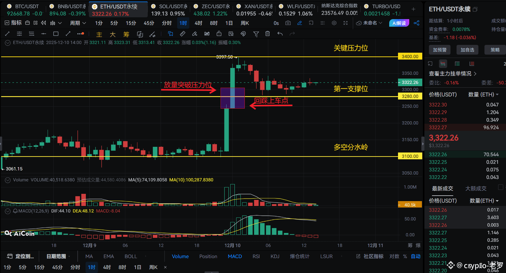 强弱分界线:3280美元。当前的盘整支撑。若回踩该位置能迅速反弹,则市场结构仍健康;若放量跌破,则意味着上攻动能短期衰竭,将进入调整。