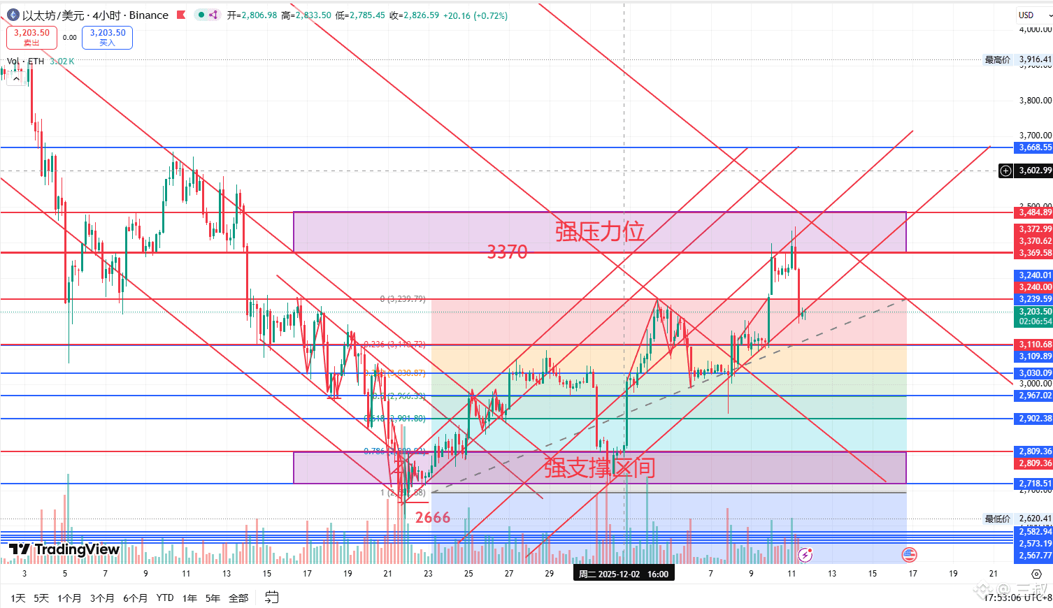 支撑区间:3180/3100 、最低点3000 (多空关键转换位,支撑强度最高)