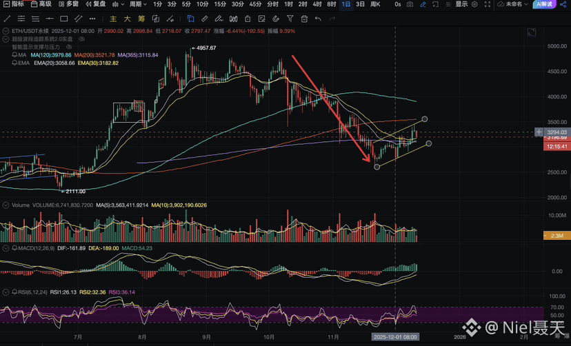 这里以ETH举例 K线图明确 一段下跌行情后 开启平行上移通道