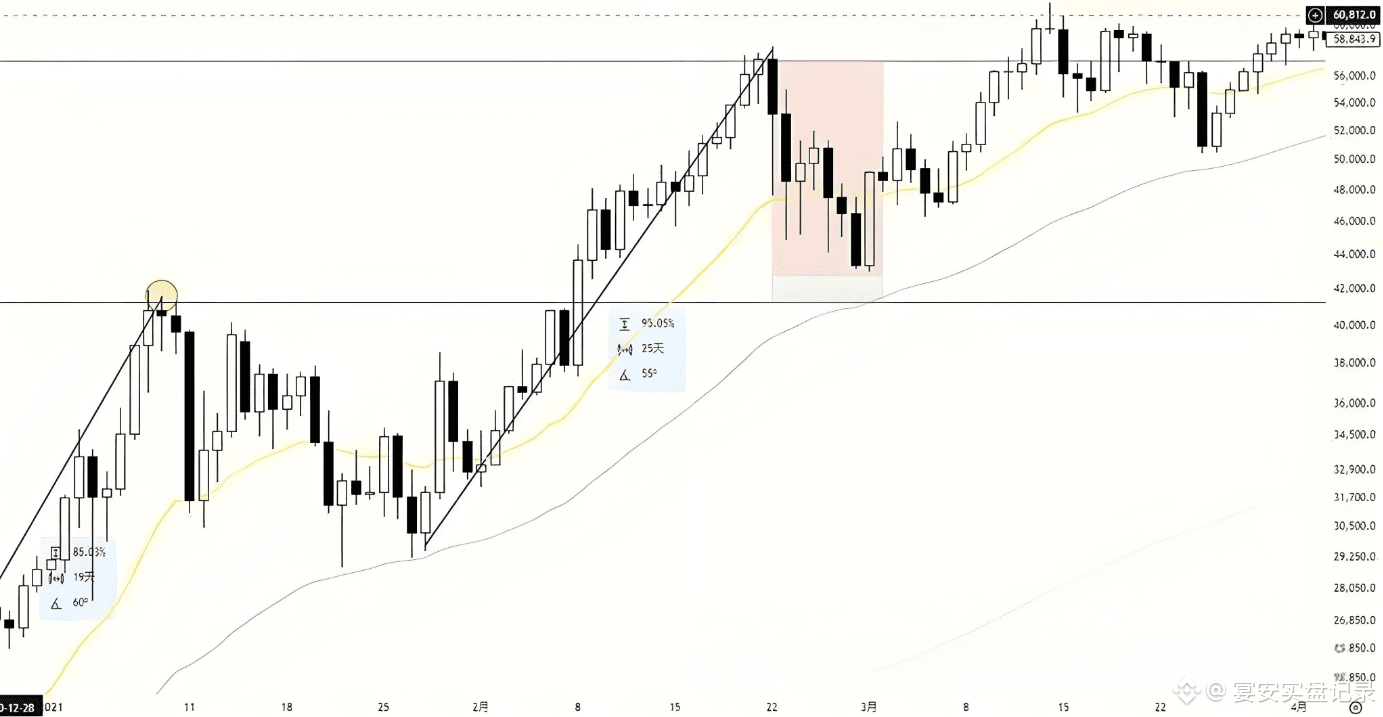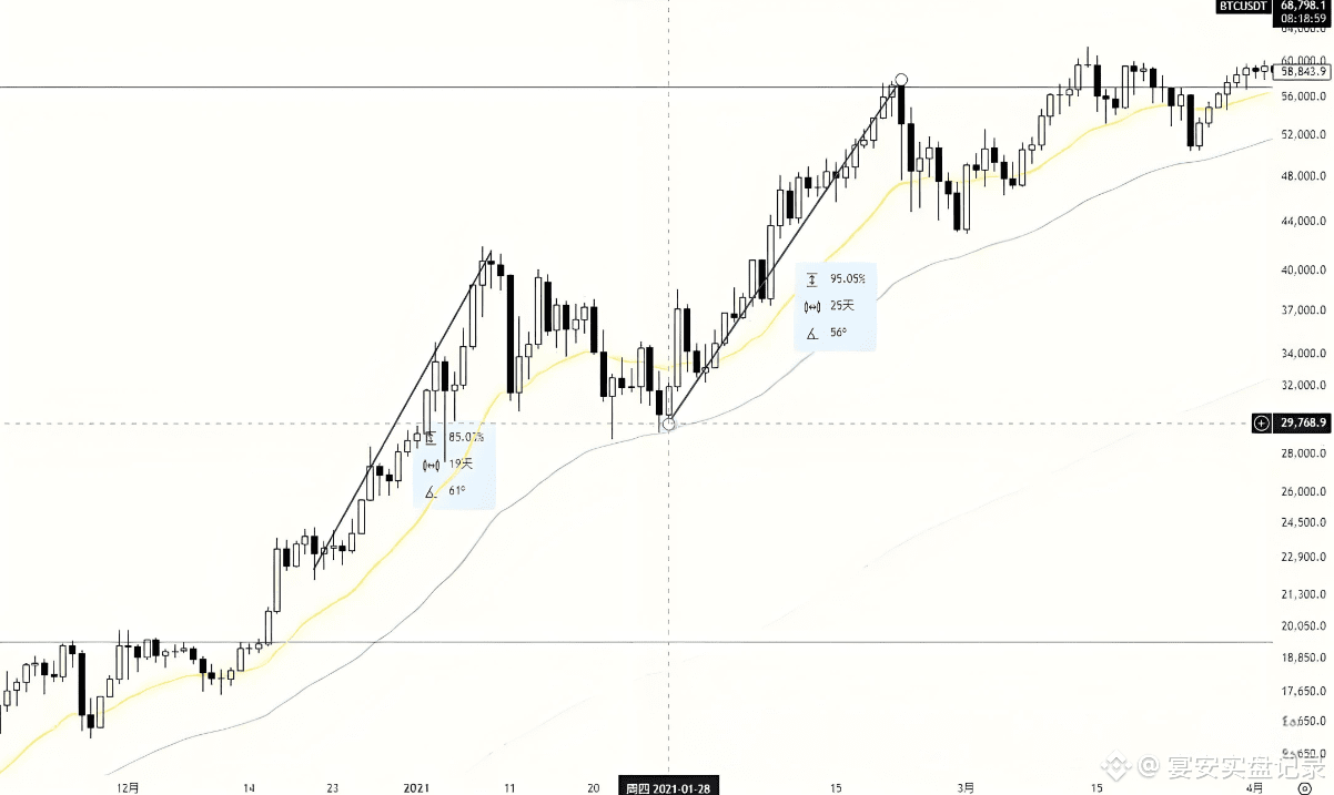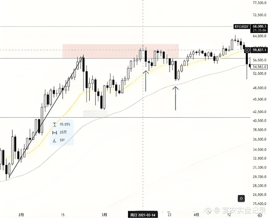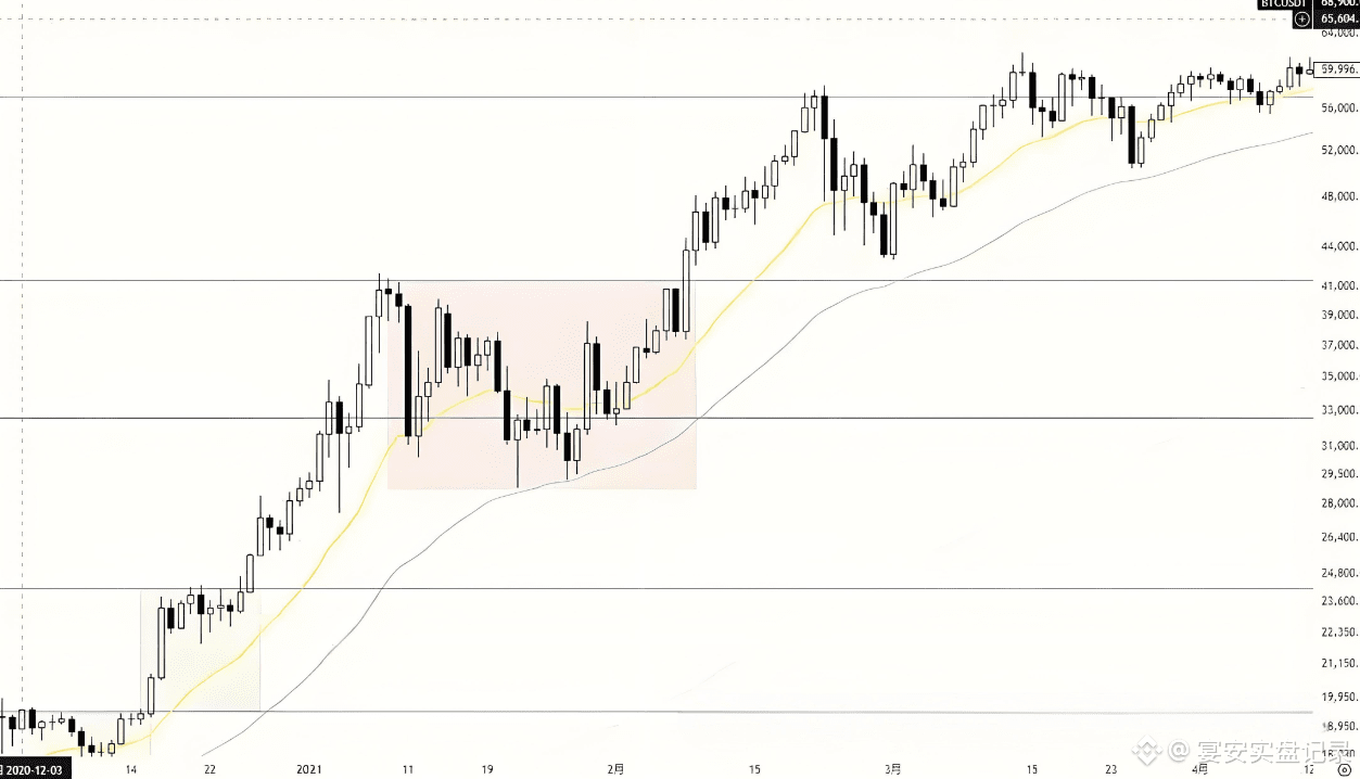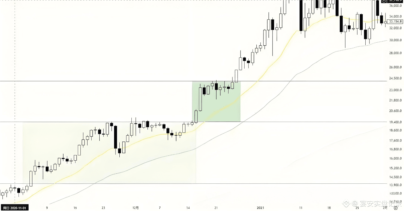 回到 K 线图上,我们可以看到初始一段上涨的走势($14000-$20000 之间)显得犹豫不决,因为出现了重叠的 K 线排列。每上涨一点,价格就会回撤一点,再上涨一点。这种现象反映了市场主力之间的不同看法。#美SEC代币化股票交易计划